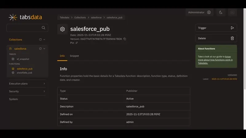 With Tabsdata’s 1.3.0 release, we introduce new connectors for Salesforce reports that allow you to easily Publish Salesforce Report Data. All you need is your salesforce report name and you can easily propagate salesforce report data while automatically snapshotting and versioning the data as well.