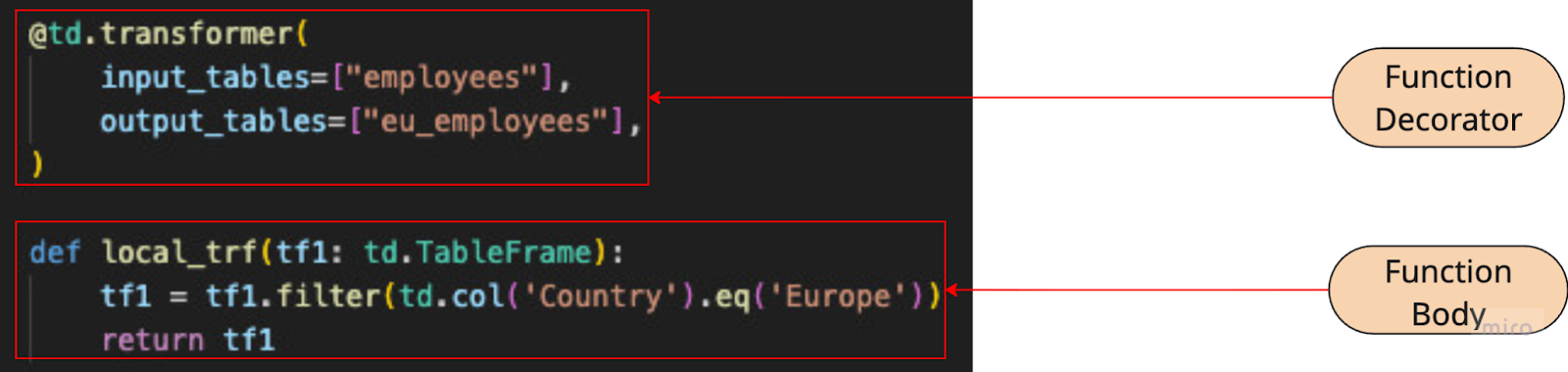 Since transformers read from Tabsdata Tables and write into new Tabsdata Tables, the input_tables parameter defines the input for the function body and the output_tables parameter defines where data returned by the function body will go.