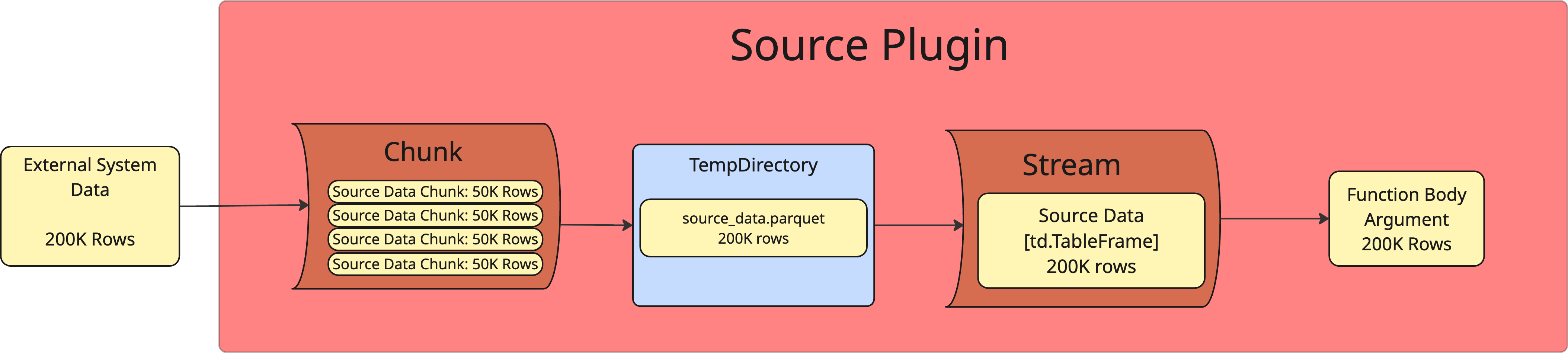 For Source Plugins, the chunk() method fetches external data, in chunks if necessary, and writes the dataset into a temporary working directory on the Tabsdata server in parquet format. The stream method reads the parquet data from the working directory and converts the data into a Tableframe, which is analogous to a polars lazyframe, and passes the Tableframe as an argument to the function body.
