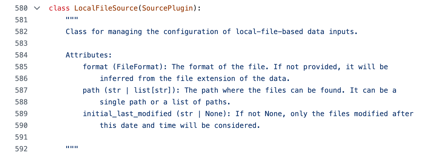 To help drive the point home, here is the class definition for the LocalFileSource connector that reads local system data into Tabsdata Tables